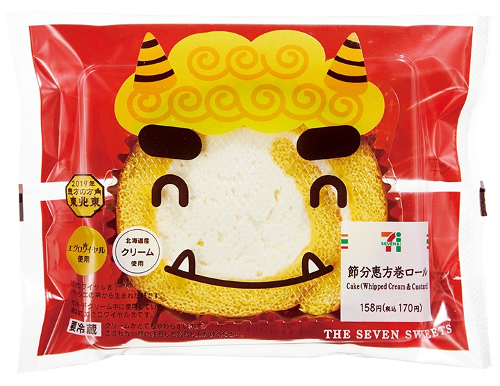 「節分 恵方巻ロール」税込170円切ってはあるものの巻ものということで、節分の定番スイーツになりつつあるロールケーキ。パッケージが鬼のかわいい節分限定バージョンです。